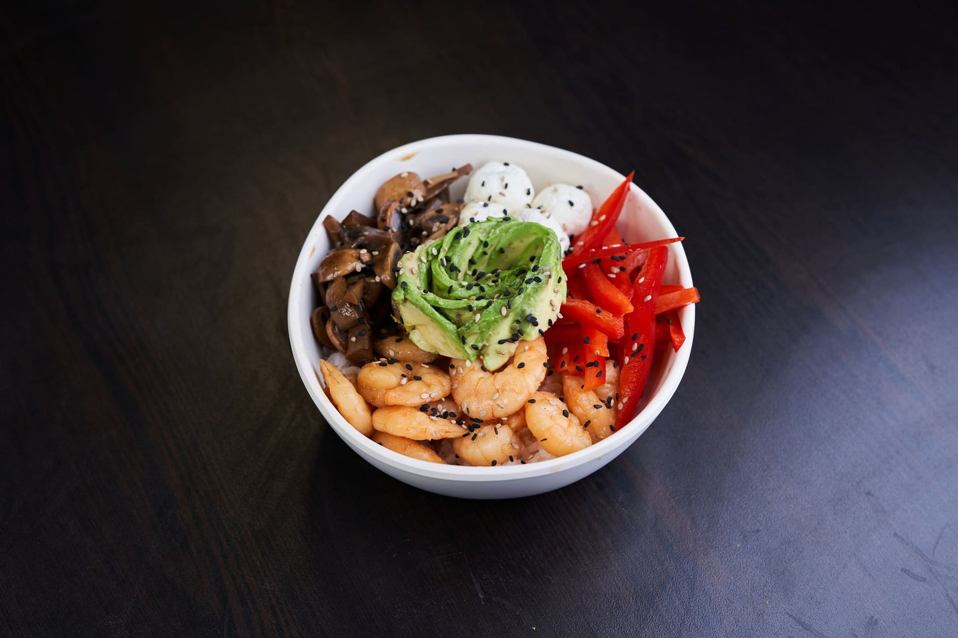 Bowl de arroz acompañado con camarones 36/40 salteados en mantequilla japonesa, bolitas de queso crema, palta laminada, pimentón rojo en juliana, champiñon; con topping de sésamo o ciboullete.