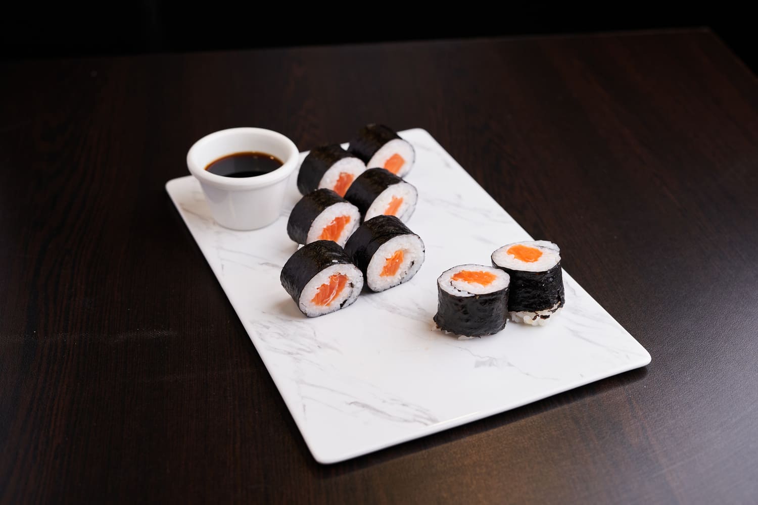 Fino rollo de arroz sazonado y salmón fresco, envuelto en alga nori.