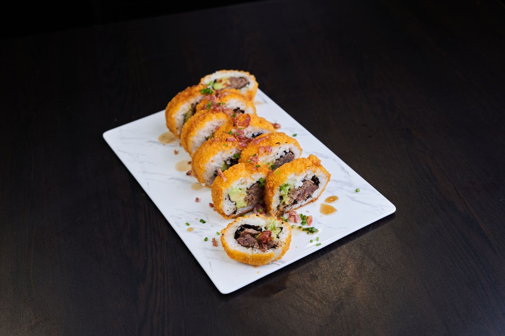 Rollo de arroz sazonado, carne de vacuno desmechado y palta. Envuelto en panko, con toppings de tocino crispy y salsa teriyaki.