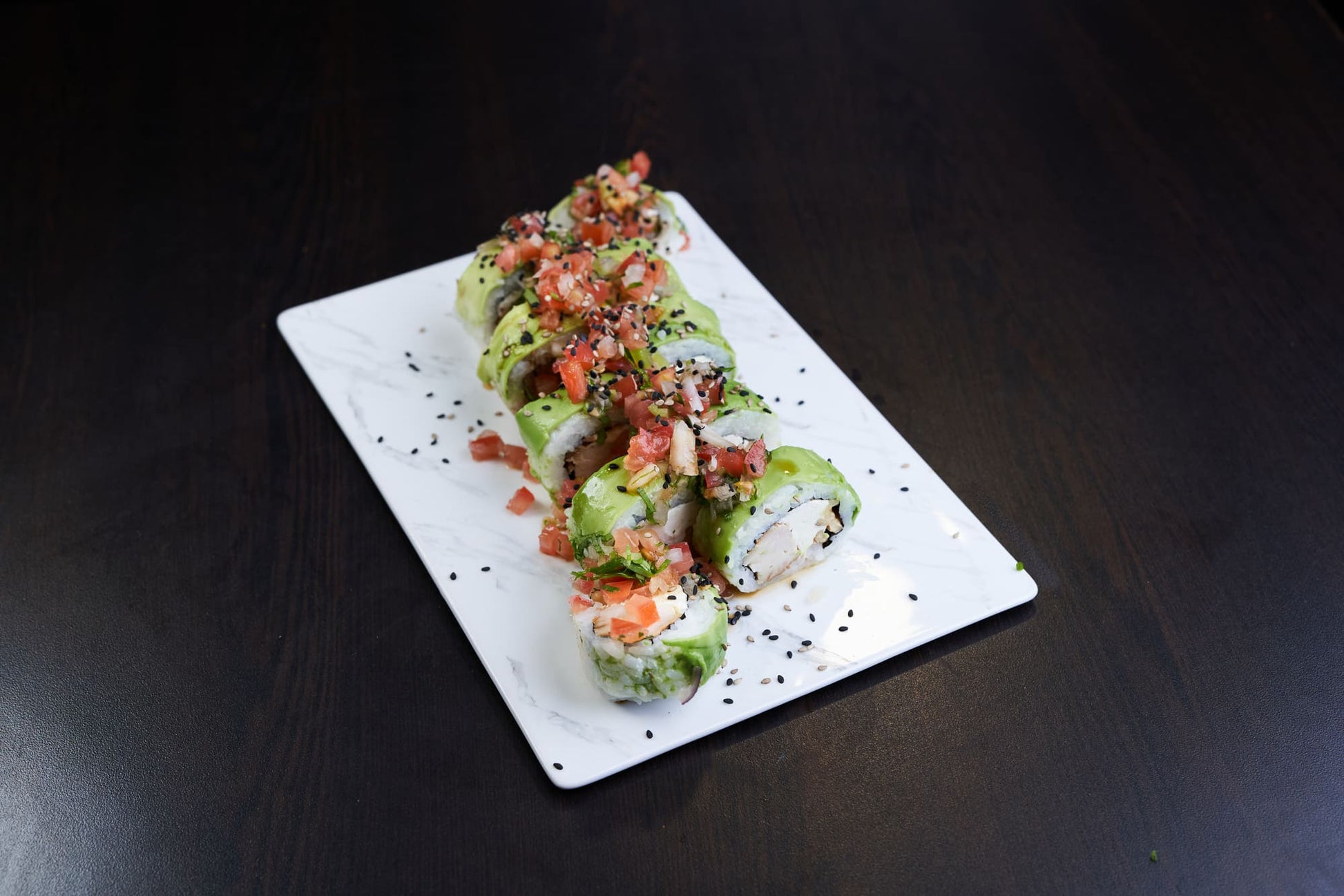 Rollo de arroz sazonado, pollo teriyaki, queso crema y nueces. Envuelto en láminas de palta, con topping de chalaquita, sésamo tostado y salsa de soya.