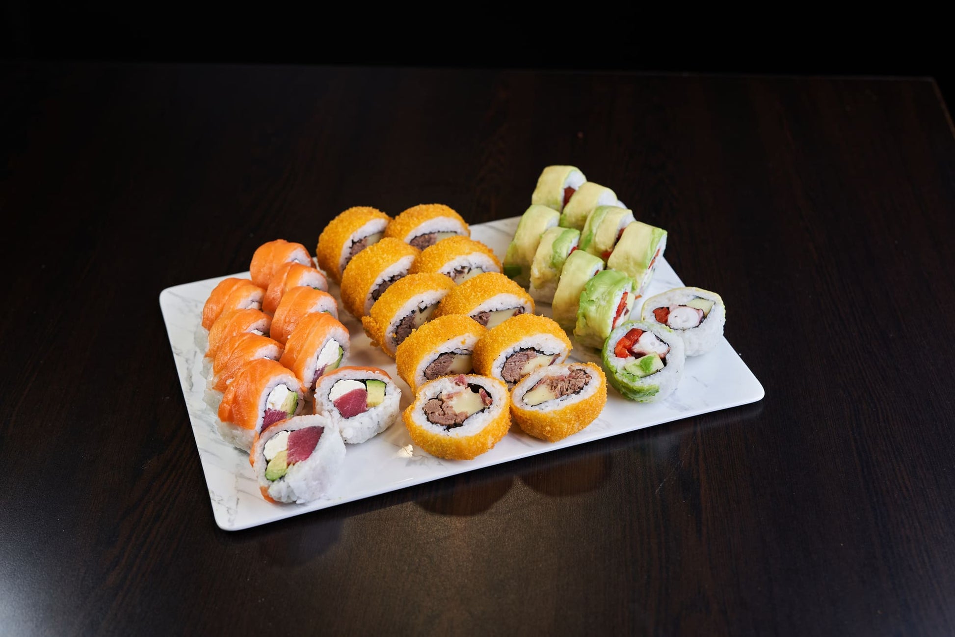 Maguro sake rolls: Arroz sazonado, cortes de atún, palta, queso crema envuelto en salmón.