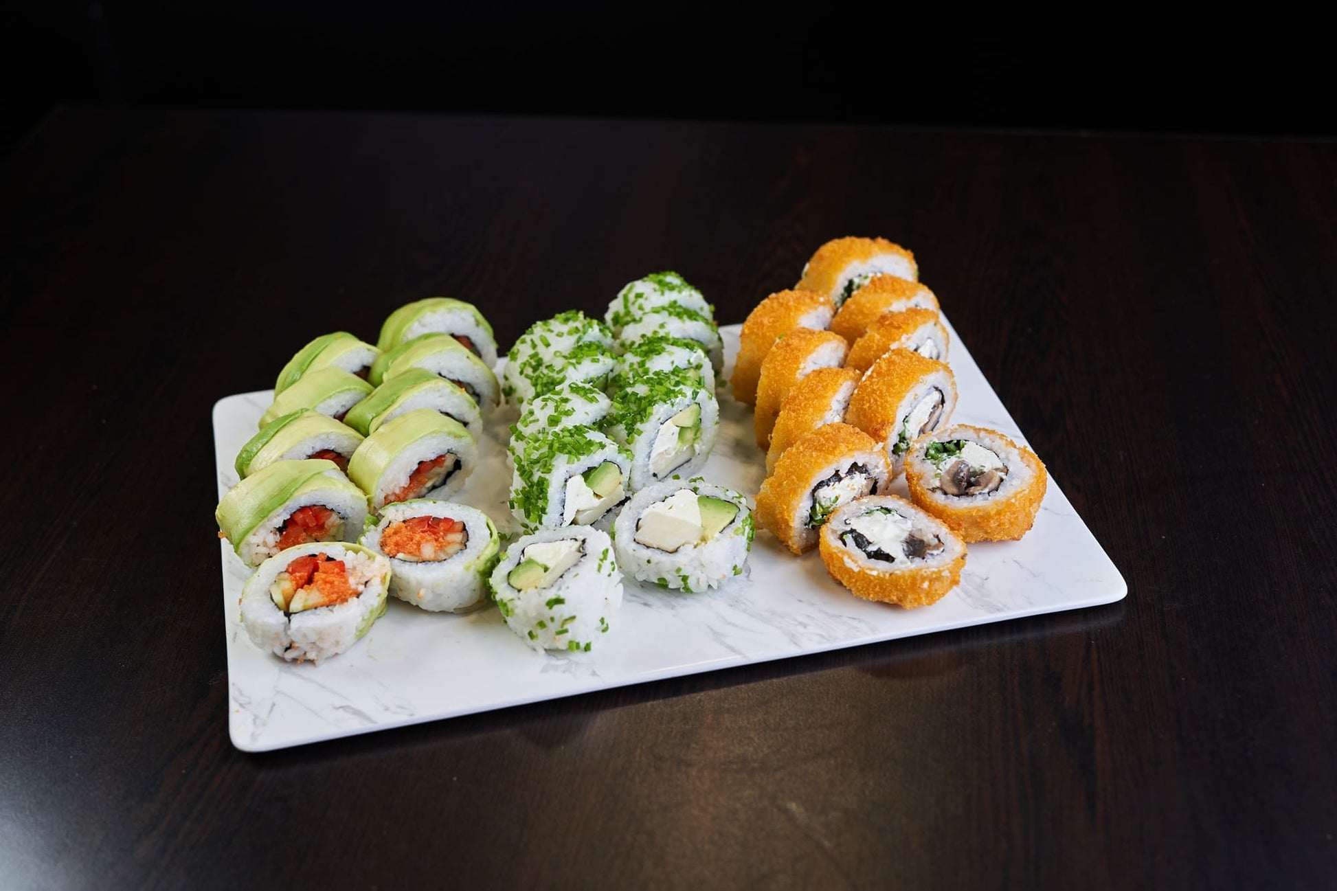 Kyuri avocado rolls: Arroz sazonado, pepino, pimentón rojo, manzana envuelto en palta.