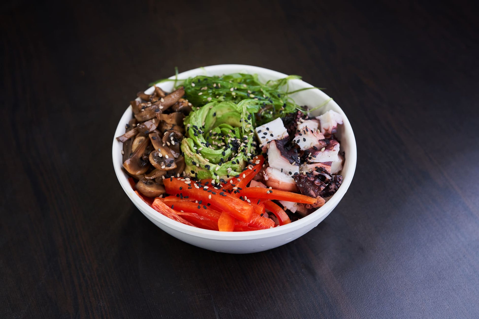 Bowl de arroz acompañado con cortes de pulpo, pimentón rojo en juliana, palta laminado, champiñón paris salteado en mantequilla japonesa y alga wakame; con topping de sésamo o ciboullete.
